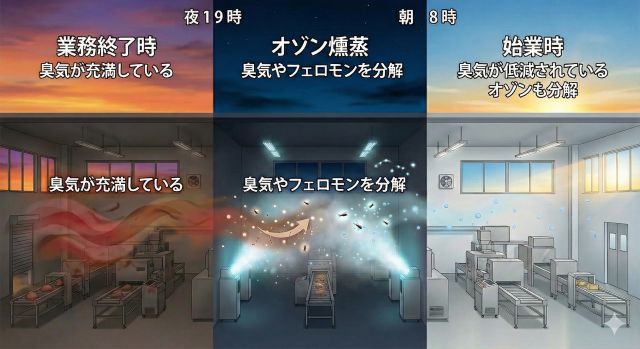 オゾン燻蒸は夜間の無人時間帯に自動運転で行い、始業時には臭気だけでなくオゾンも分解されている状況を作り出します。
